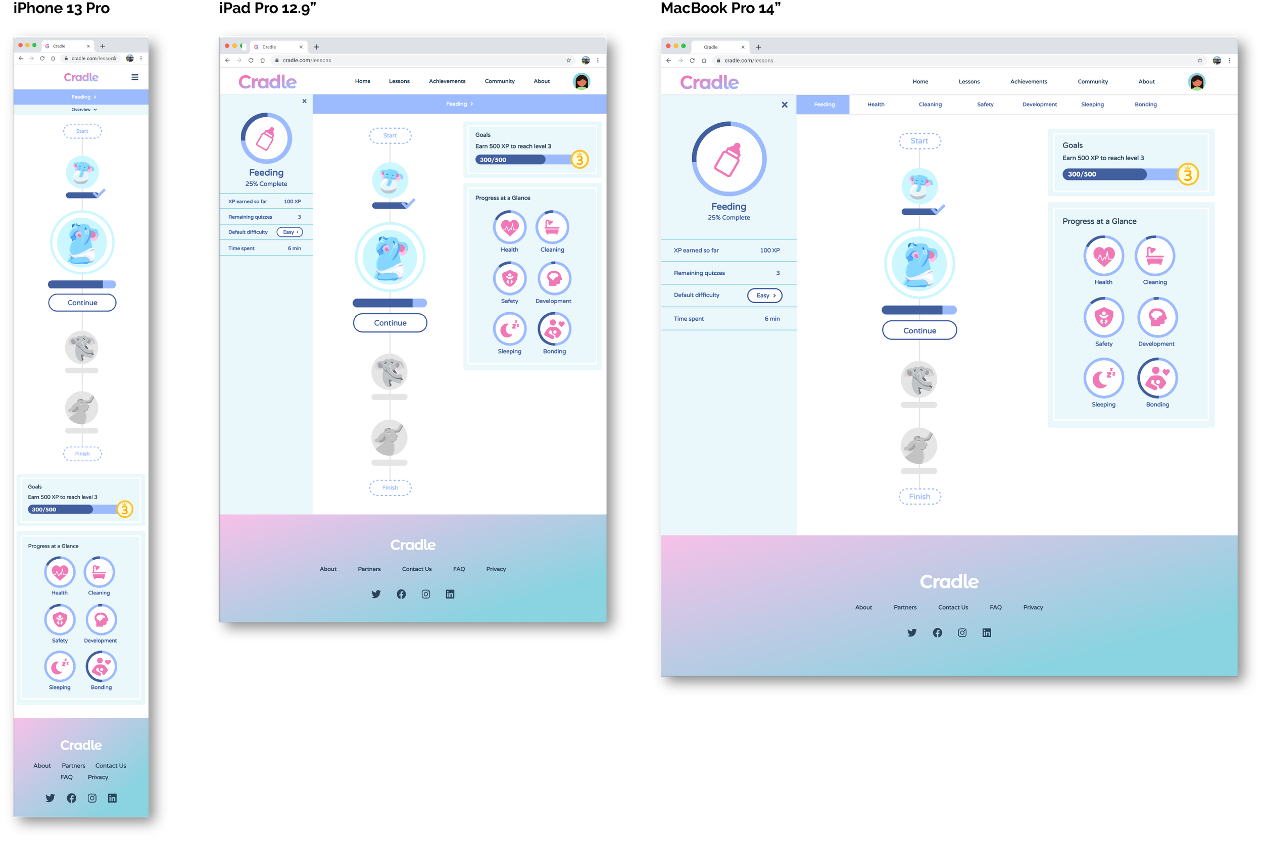 With the app designs completed, I started work on designing the responsive website. I used the Cradle site map to guide the information architecture of site navigation to ensure a cohesive and consistent experience across devices.