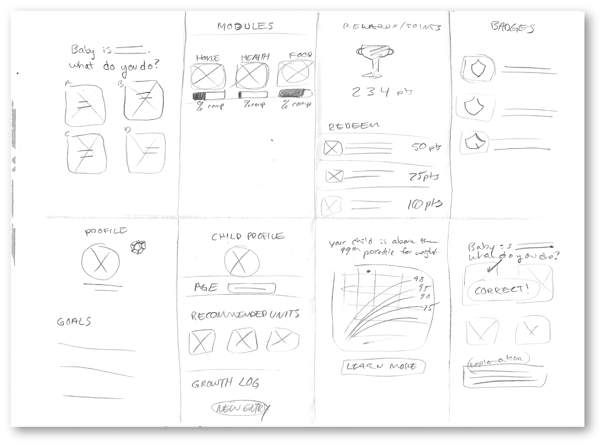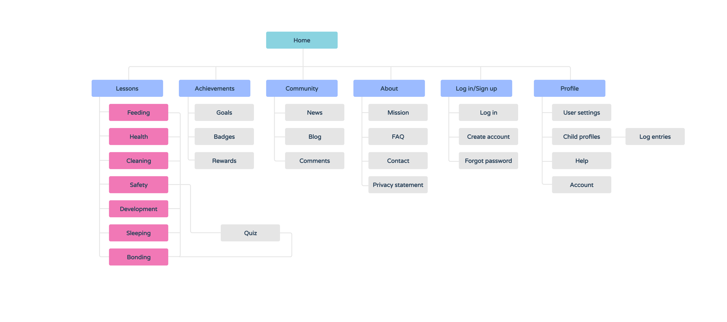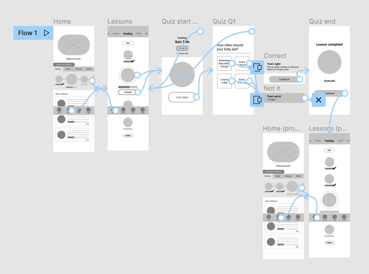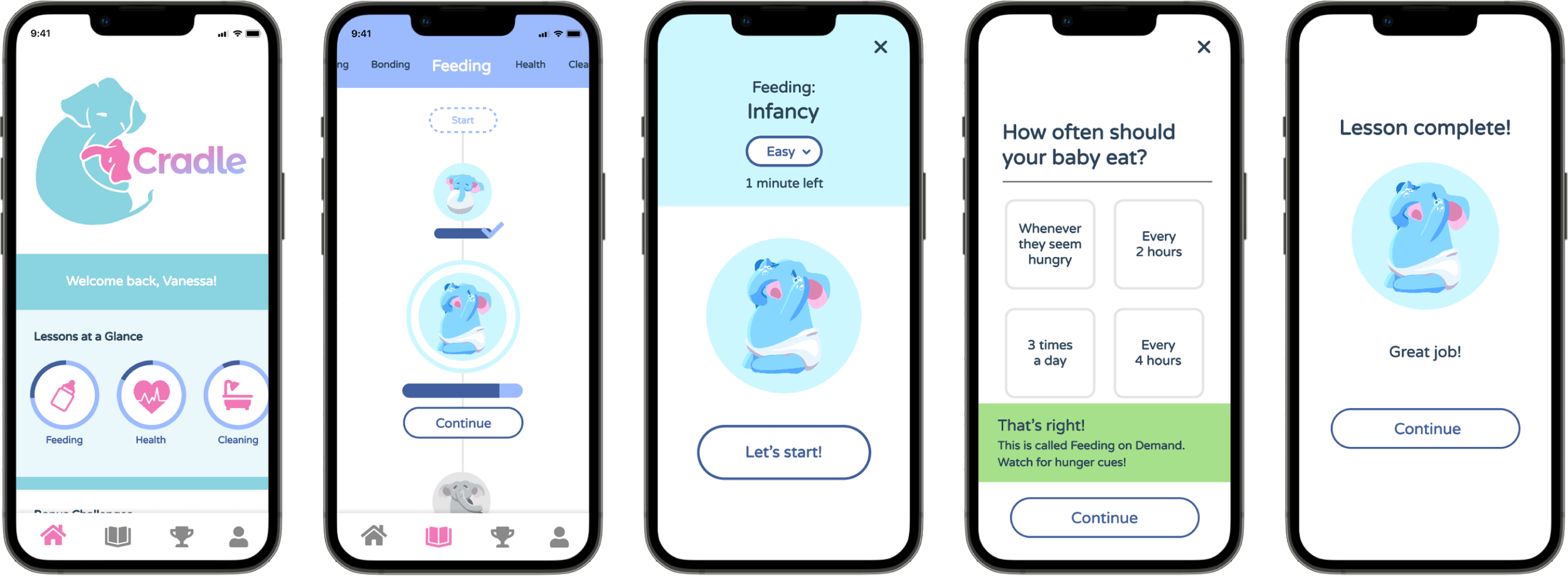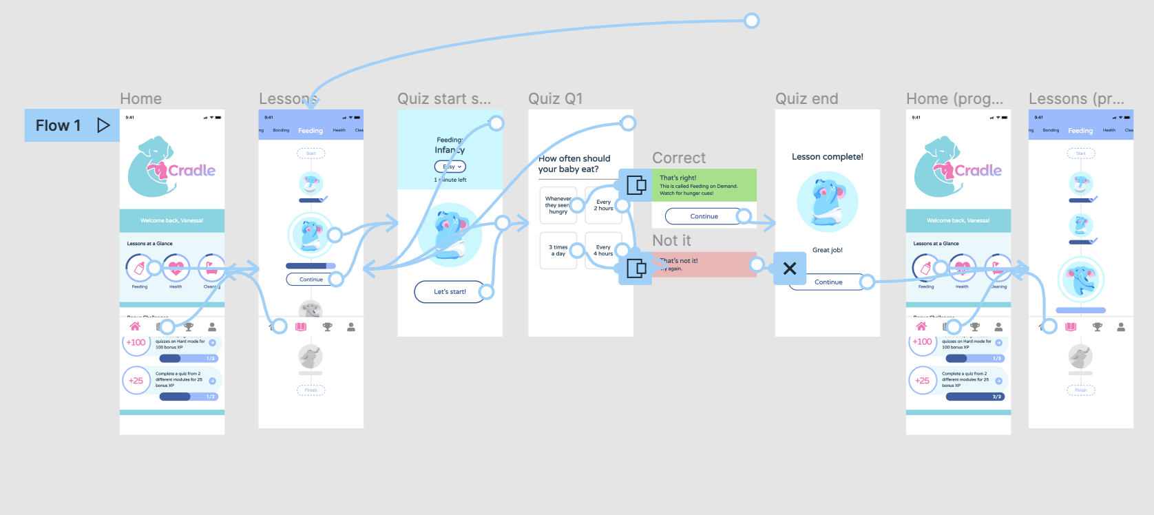 I designed a user flow for a fictional app named Cradle that allows first-time parents a way to reinforce their instinctive parenting knowledge and teach them what they don’t know through quiz modules on different areas of parenthood.