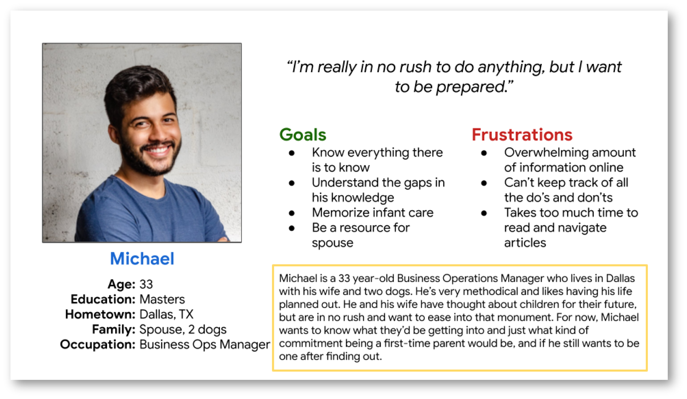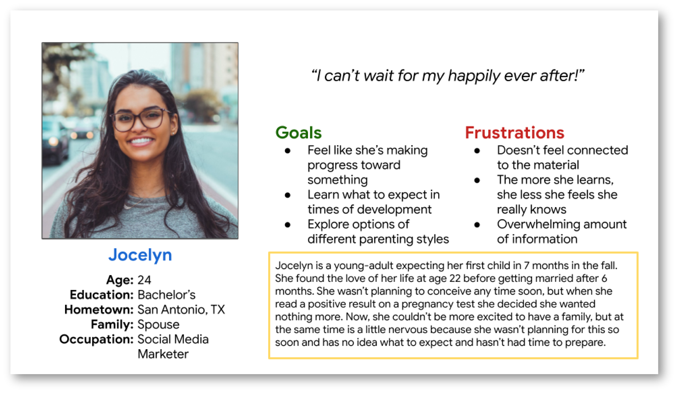 I conducted user research and received feedback from users that I incorporated into user personas. Research showed that first-time parents come from many different backgrounds of age, gender identity, profession, and circumstance. In fact, many adults who frequent parenting sites are not current parents or expecting children; they’re simply browsing online information to decide if children is something they want and if they’re ready to have them.