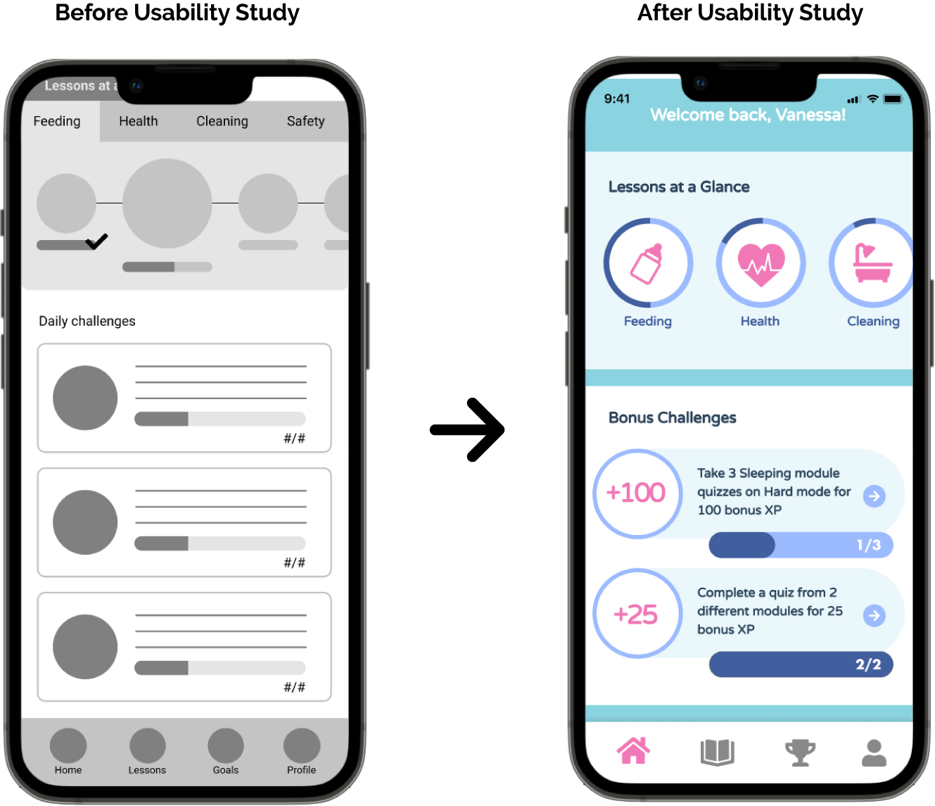 Based on the insights from the usability studies, applied design changes like updating the Lessons at a Glance panel to show a more high-level overview of module progress.