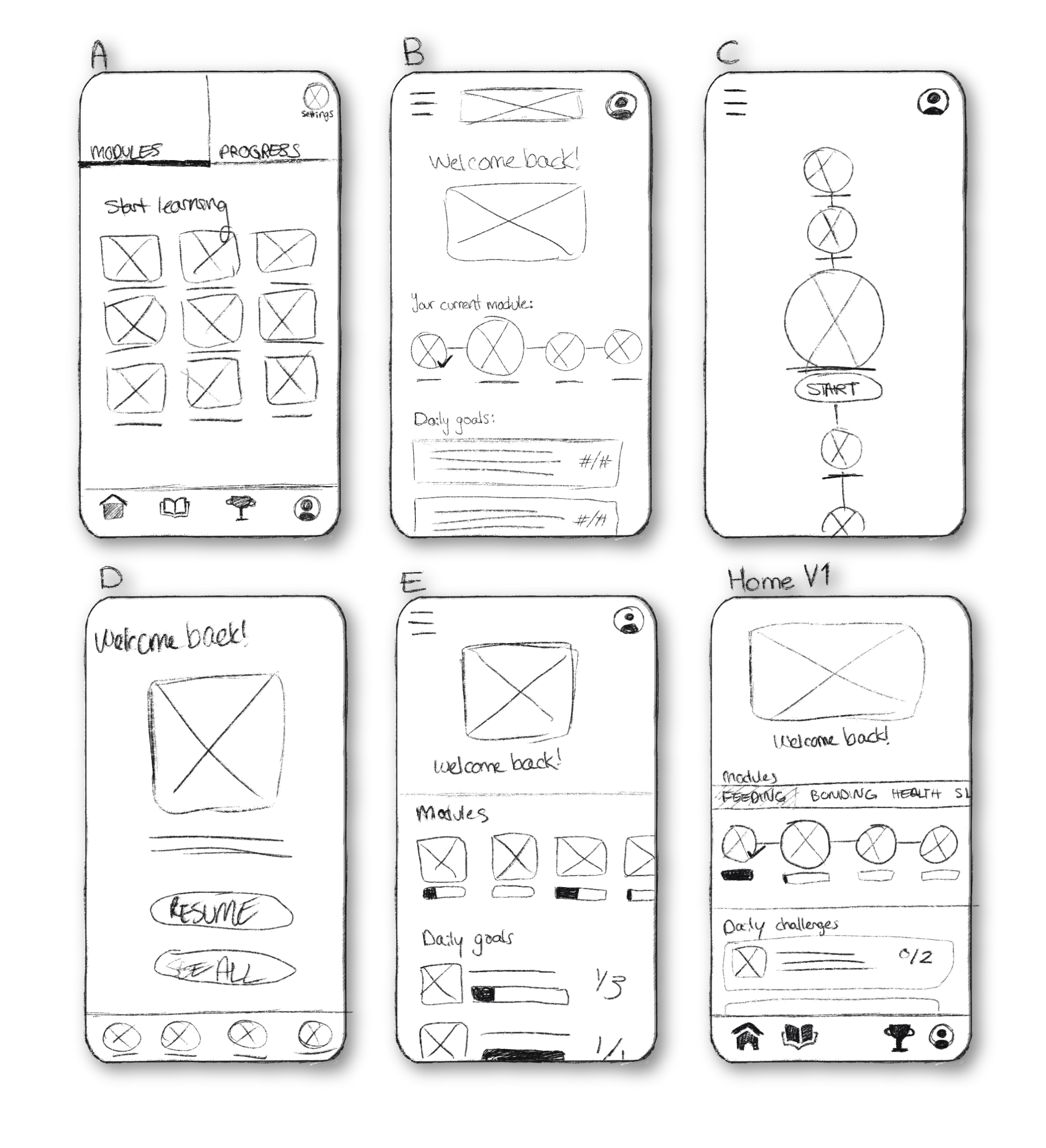 Next, I sketched out paper wireframe options for the home screen of my app. I wanted it to provide a high-level overview of learning progress with the ability to jump to active modules.