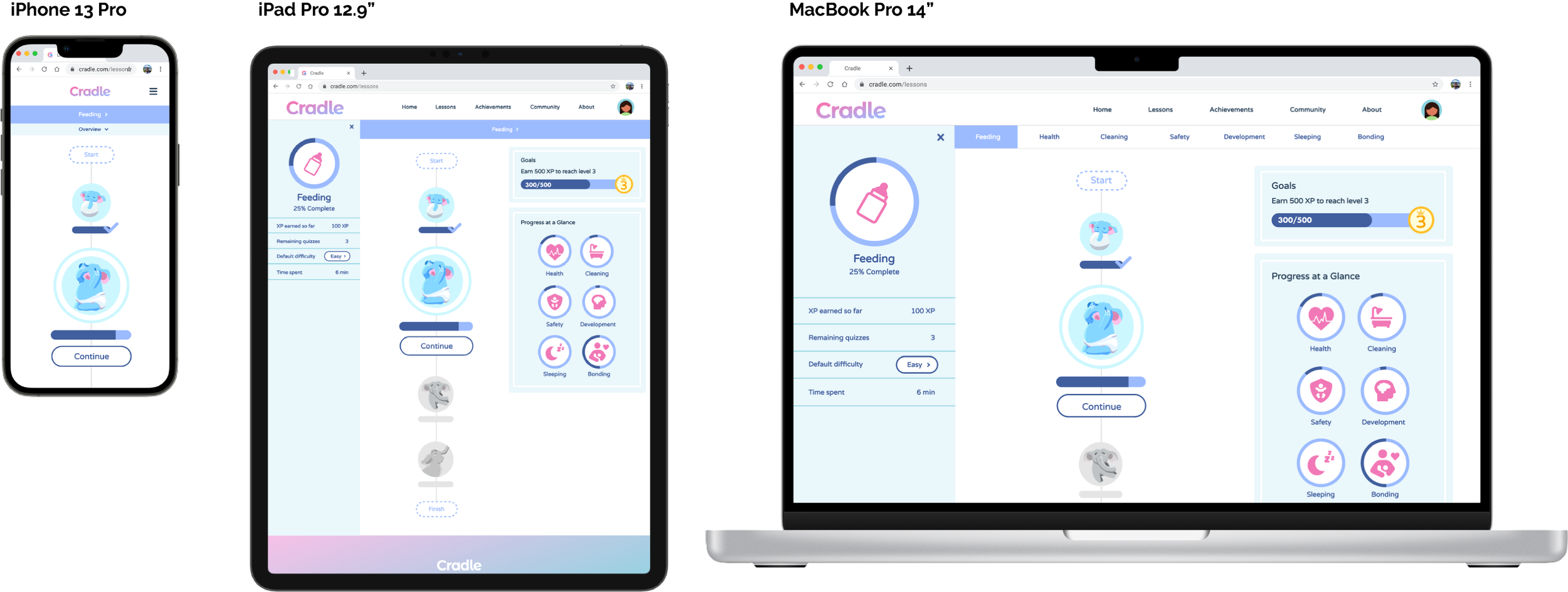 Being a first-time parent is scary, particularly in the area knowing what to do and doing it right. However, parents already instinctively know a lot about parenting, but don’t think they do. Cradle is a hypothetical responsive website and dedicated mobile app for the Google UX Design Certificate dedicated to helping adults learn about being a first-time parent, utilizing implicit learning strategies to reinforce existing knowledge and bridge gaps. Throughout this project, I was responsible for conducting competitor audits, interviews, paper and digital wireframing, low and high-fidelity prototyping, conducting usability studies, accounting for accessibility, and iterating on designs, information architecture, and responsive designs.