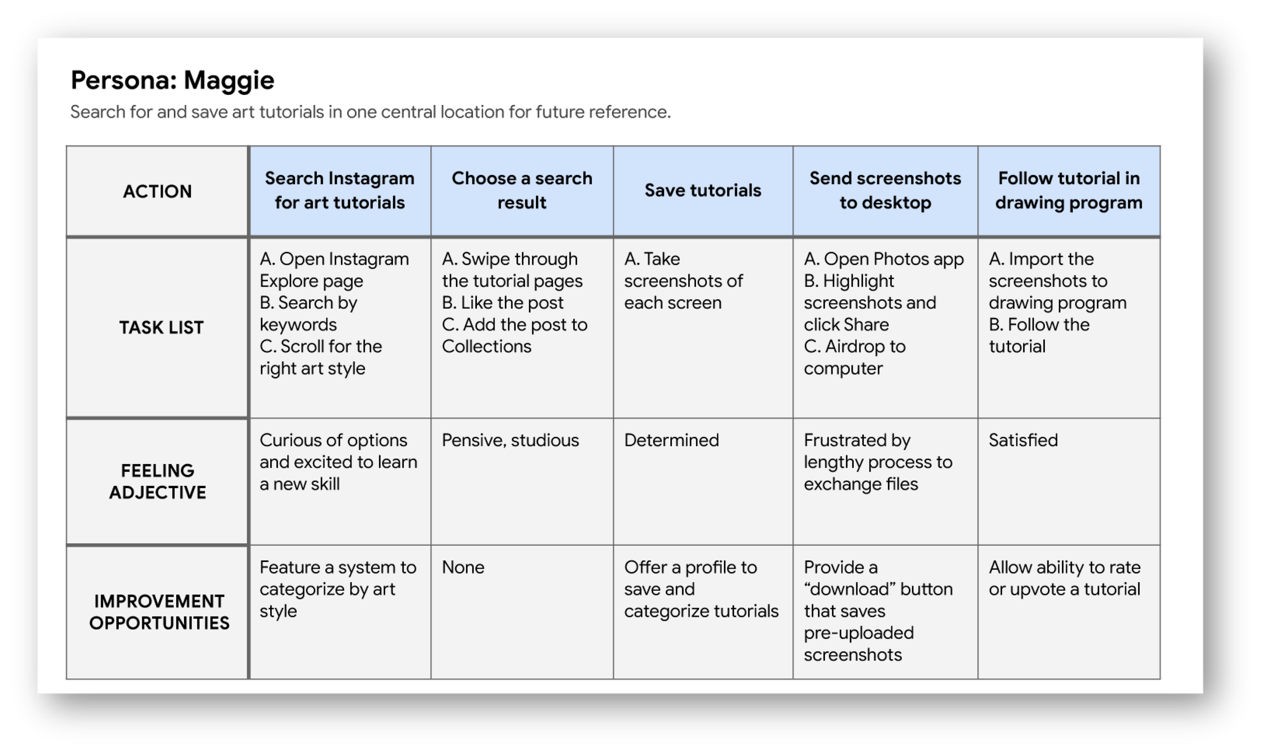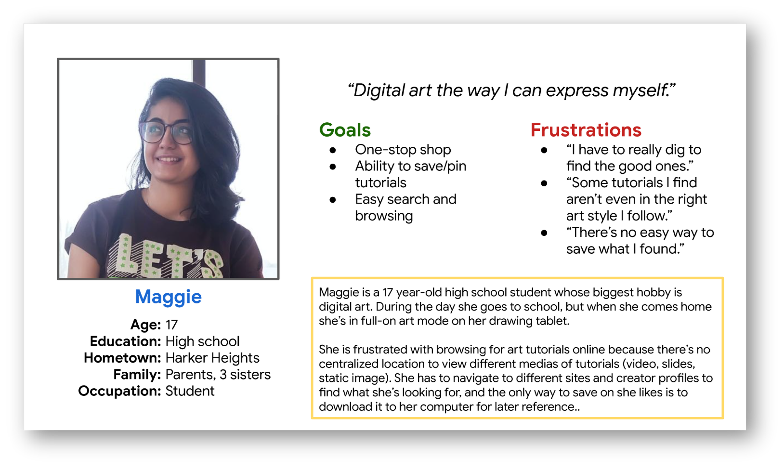 I created a user journey map of Maggie’s experience searching for art tutorials online to help identify possible pain points and improvement opportunities.
