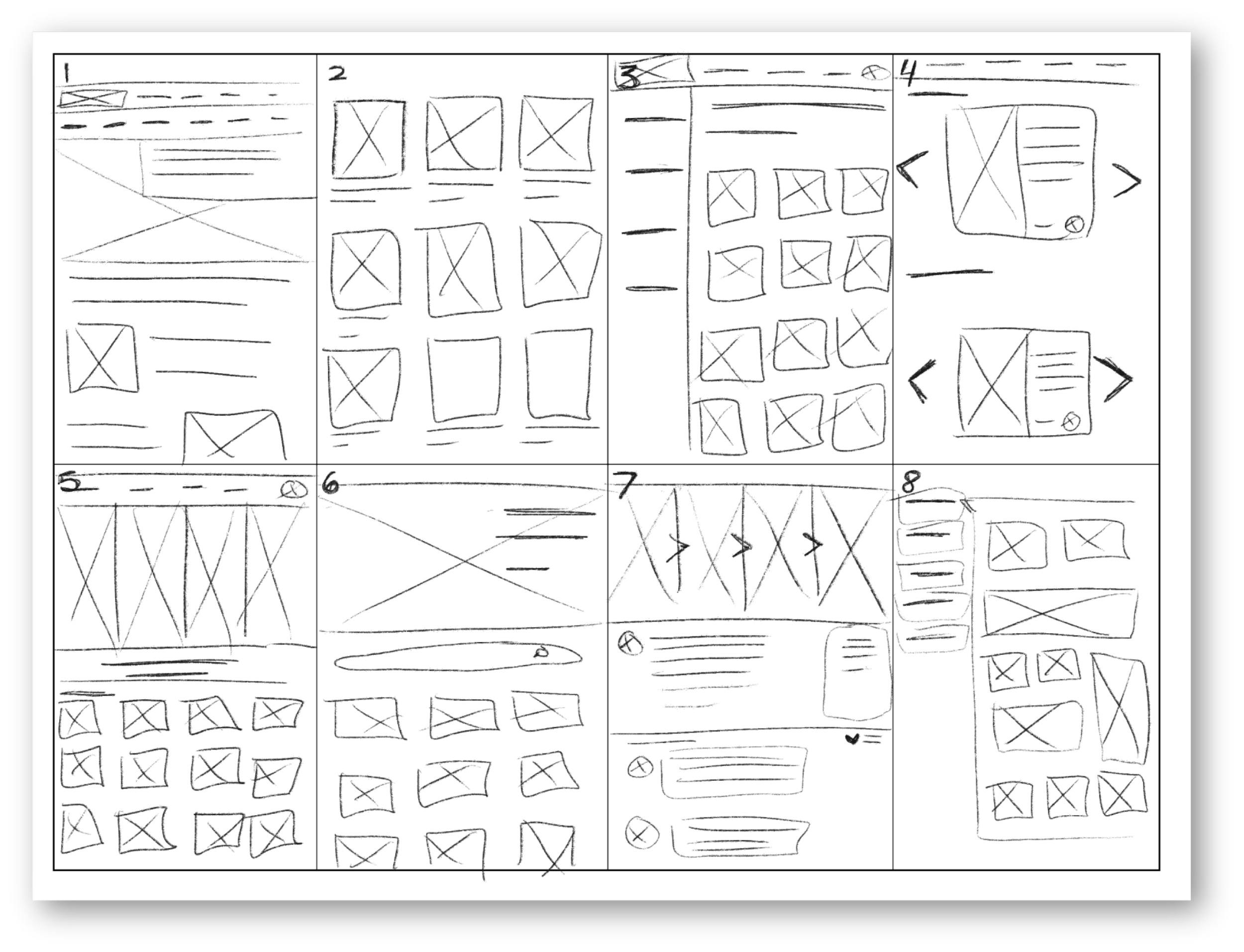 After this, I completed the Crazy Eights exercise with Maggie’s issues and the How Might We questions in mind, where I dedicate 1 minute to sketching a layout idea for 8 ideas.