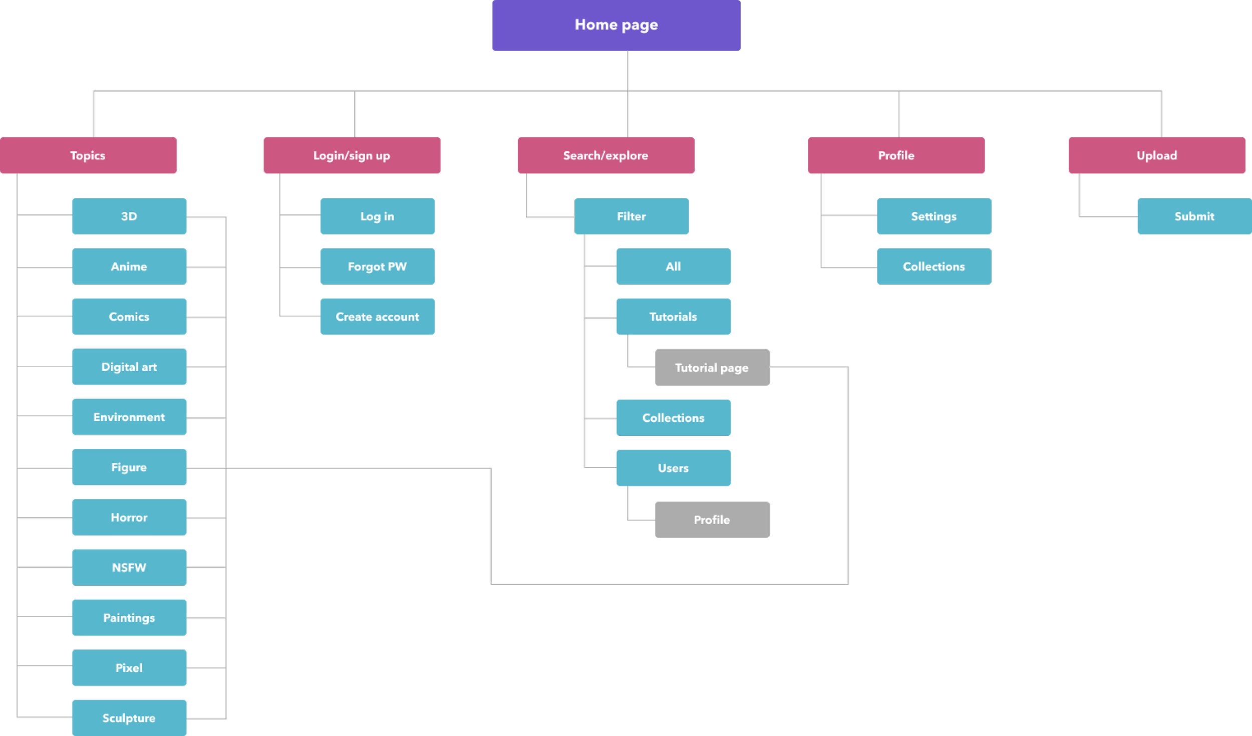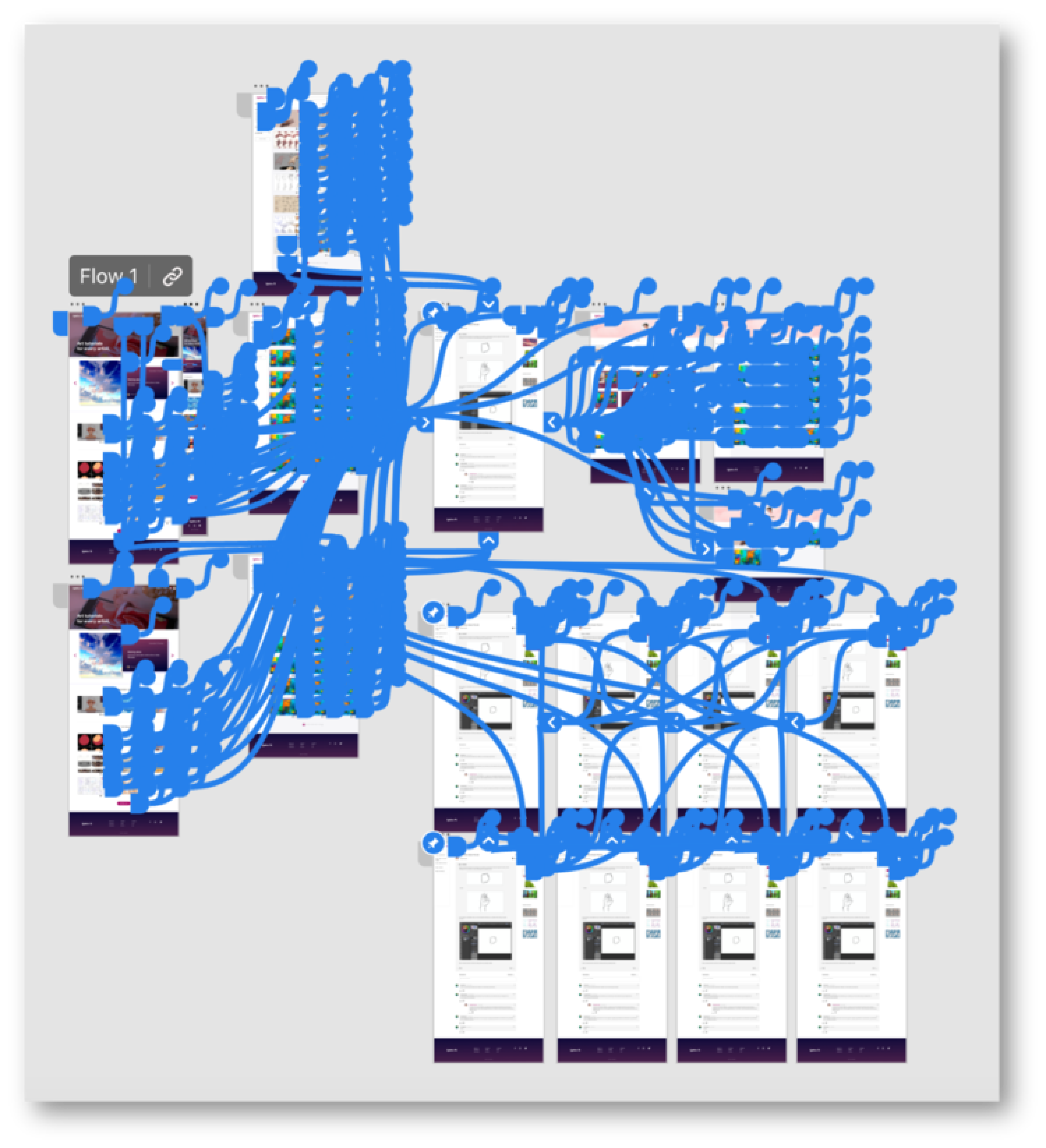 Next, I needed to make strategic information architecture decisions that would improve overall website navigation. This pass would guide me to what kinds of pages users would need to navigate to from the Home, as well as help me visualize the types of paths that could be taken in navigating the site.