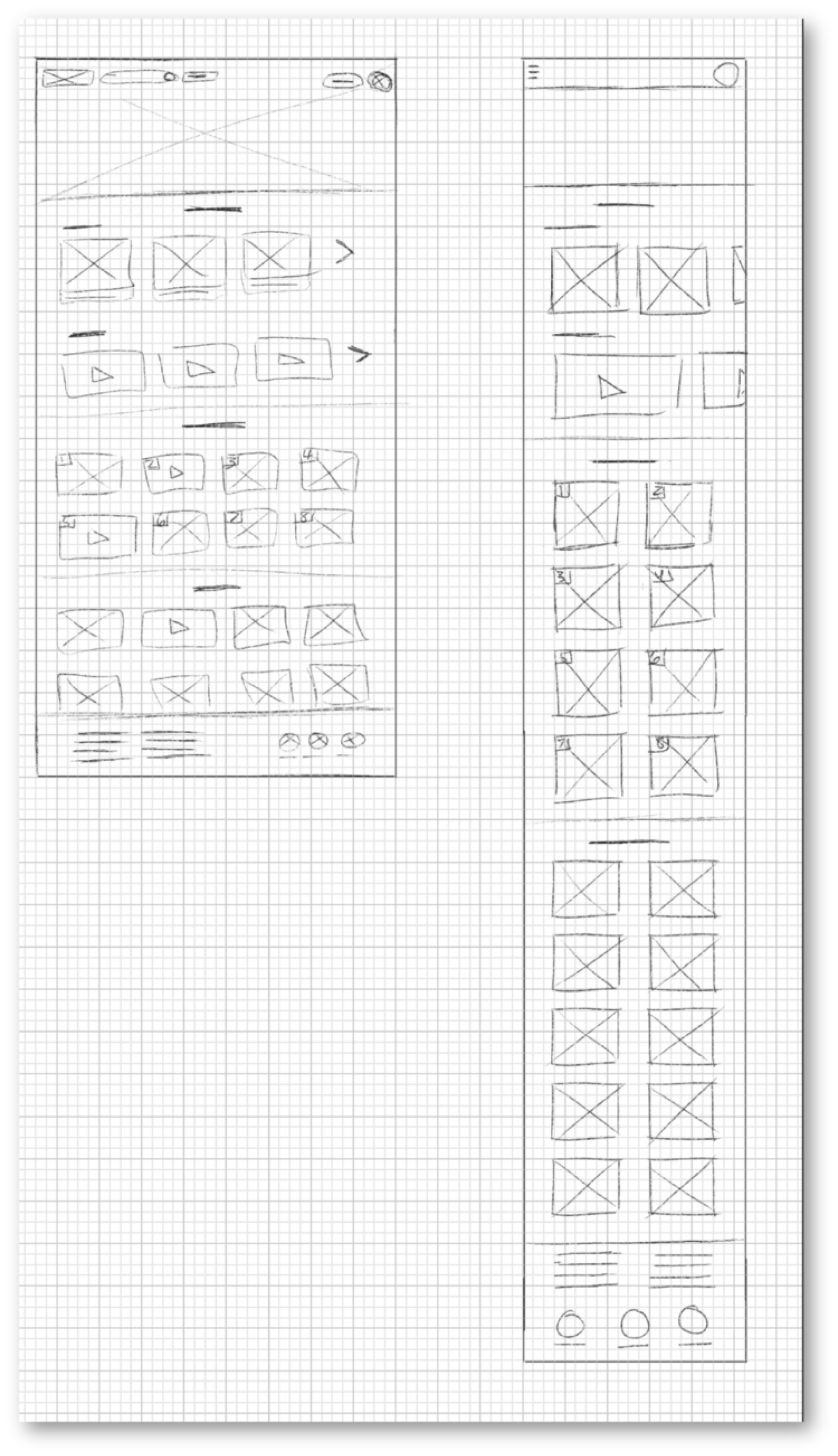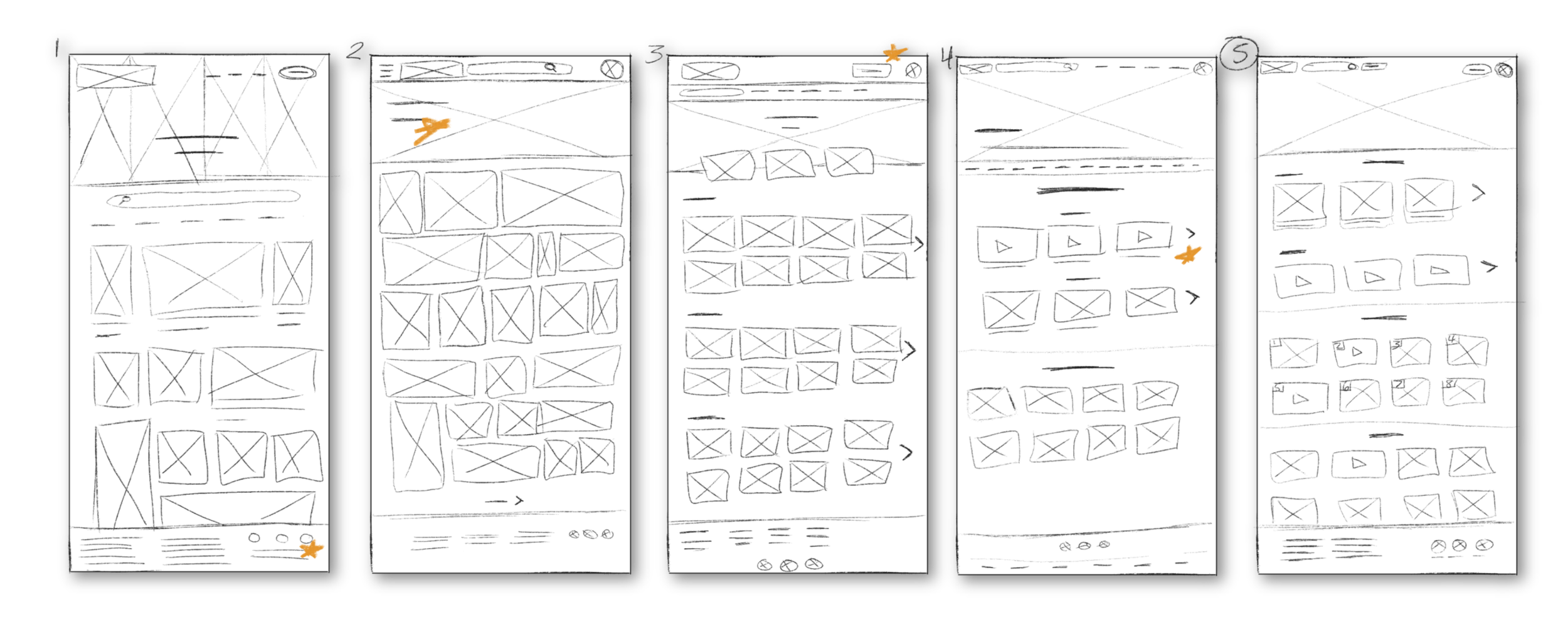 Next, I sketched out paper wireframe options for the home screen of my app, keeping the pain point of discovery in mind. I wanted it to be the primary opportunity to discover relevant and topical tutorials. Stars were used to mark the elements of each sketch that would be used in the initial digital wireframe.