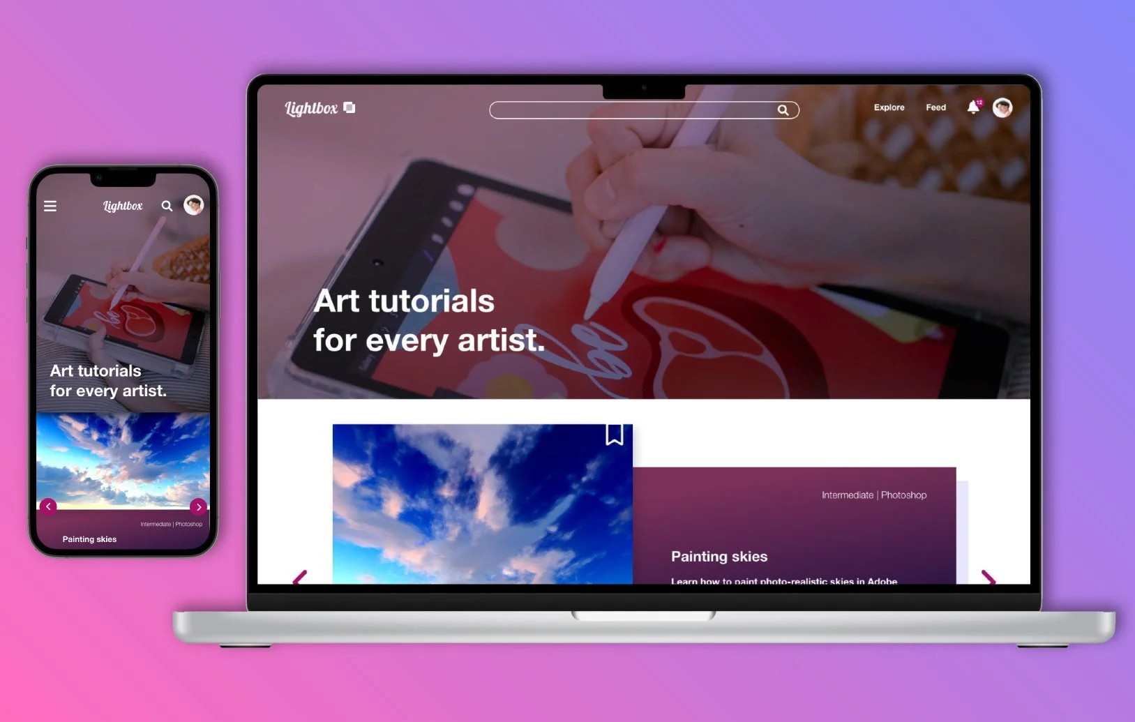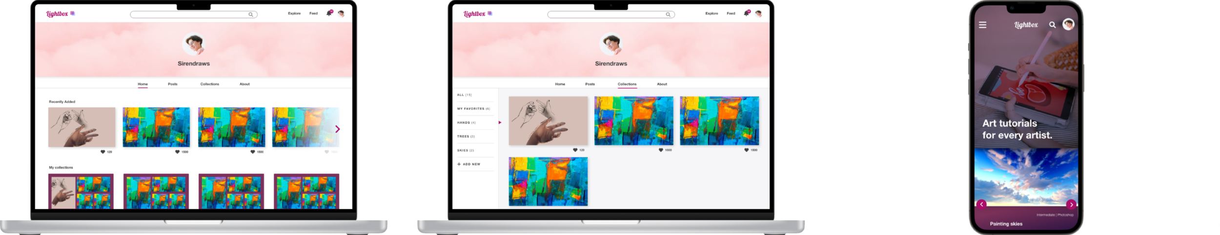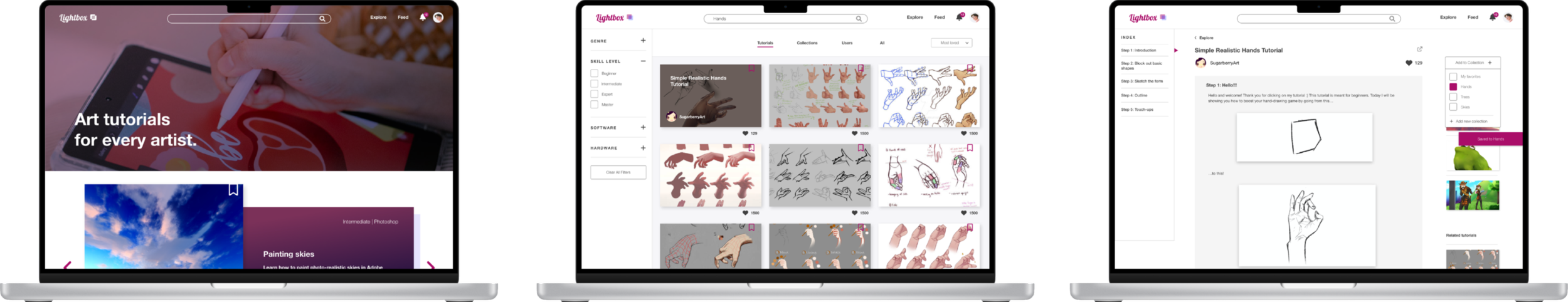Lightbox is a hypothetical art tutorial search site for artists of all skills and mediums that provides features to find, save, share, and upload art tutorials. I designed the responsive website for Lightbox from conception to delivery while completing the Google UX Design Certificate. Throughout this project, I was responsible for conducting competitor audits, interviews, paper and digital wireframing, low and high-fidelity prototyping, conducting usability studies, accounting for accessibility, responsive web UI designs, and iterating on designs.