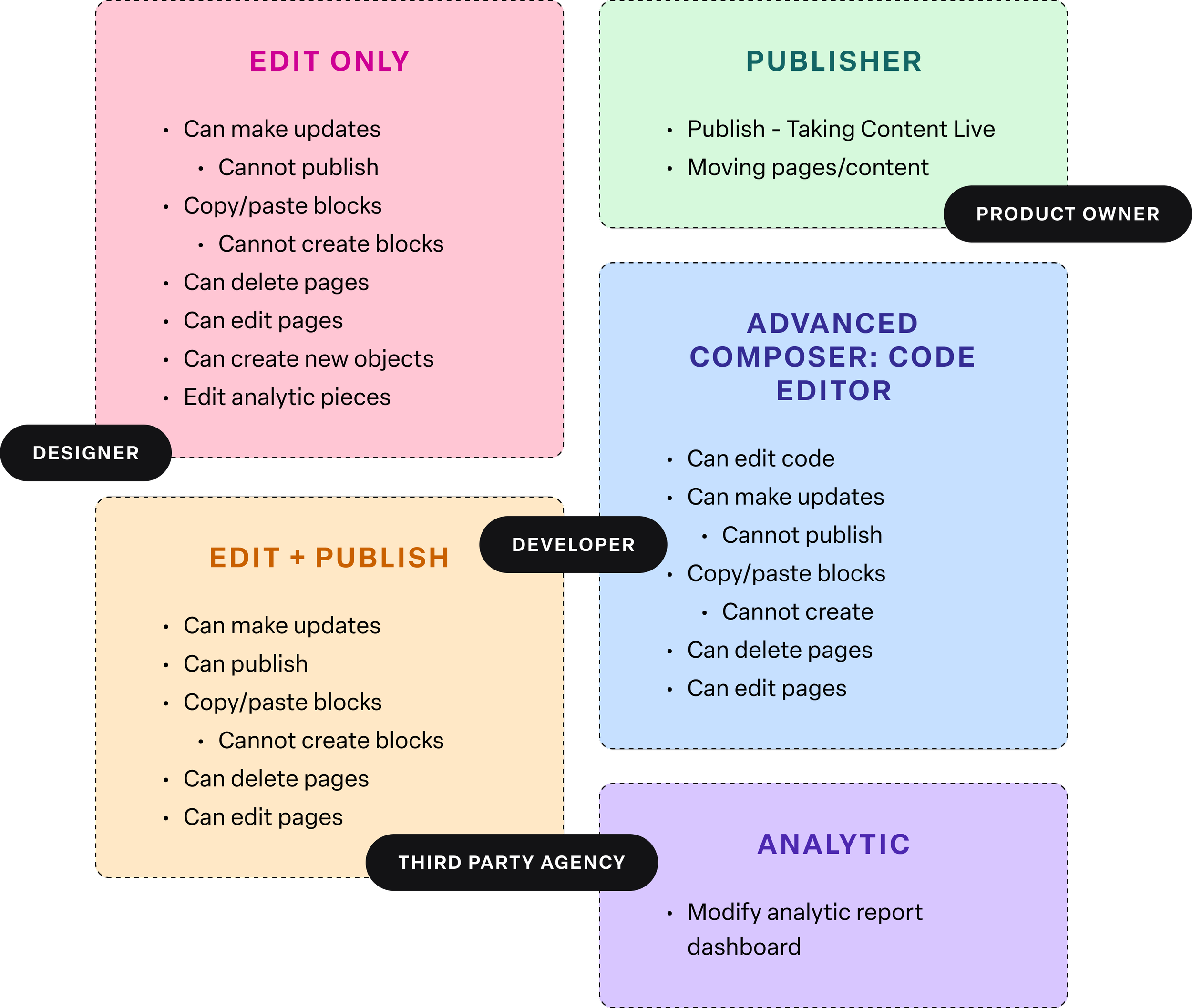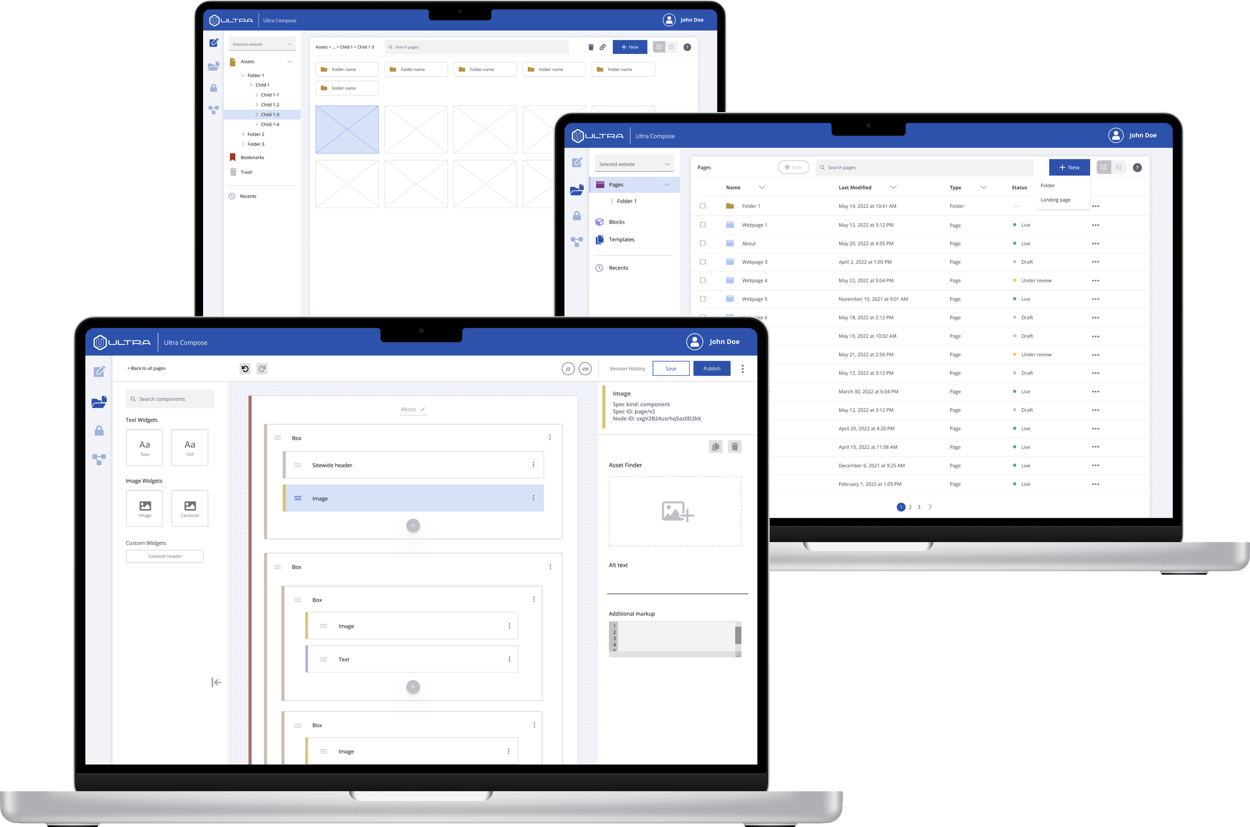 While Ultra Compose will allow any individual from developer, product owner, designer, to third party agency to perform page-building activities, there will be users of different permission-levels that contribute to the overall publishing flow. The different user levels would be: