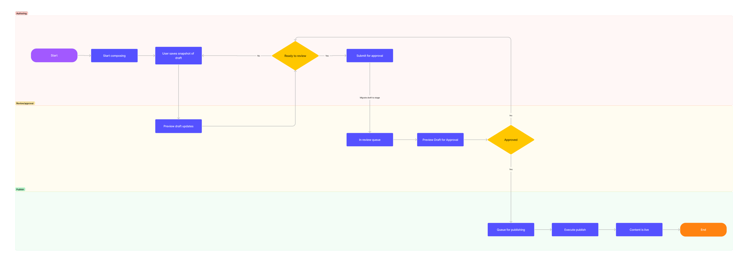 While the user journey map highlights the steps a user with baseline editing capabilities will experience, a higher-level publish flow works in the grander scheme.