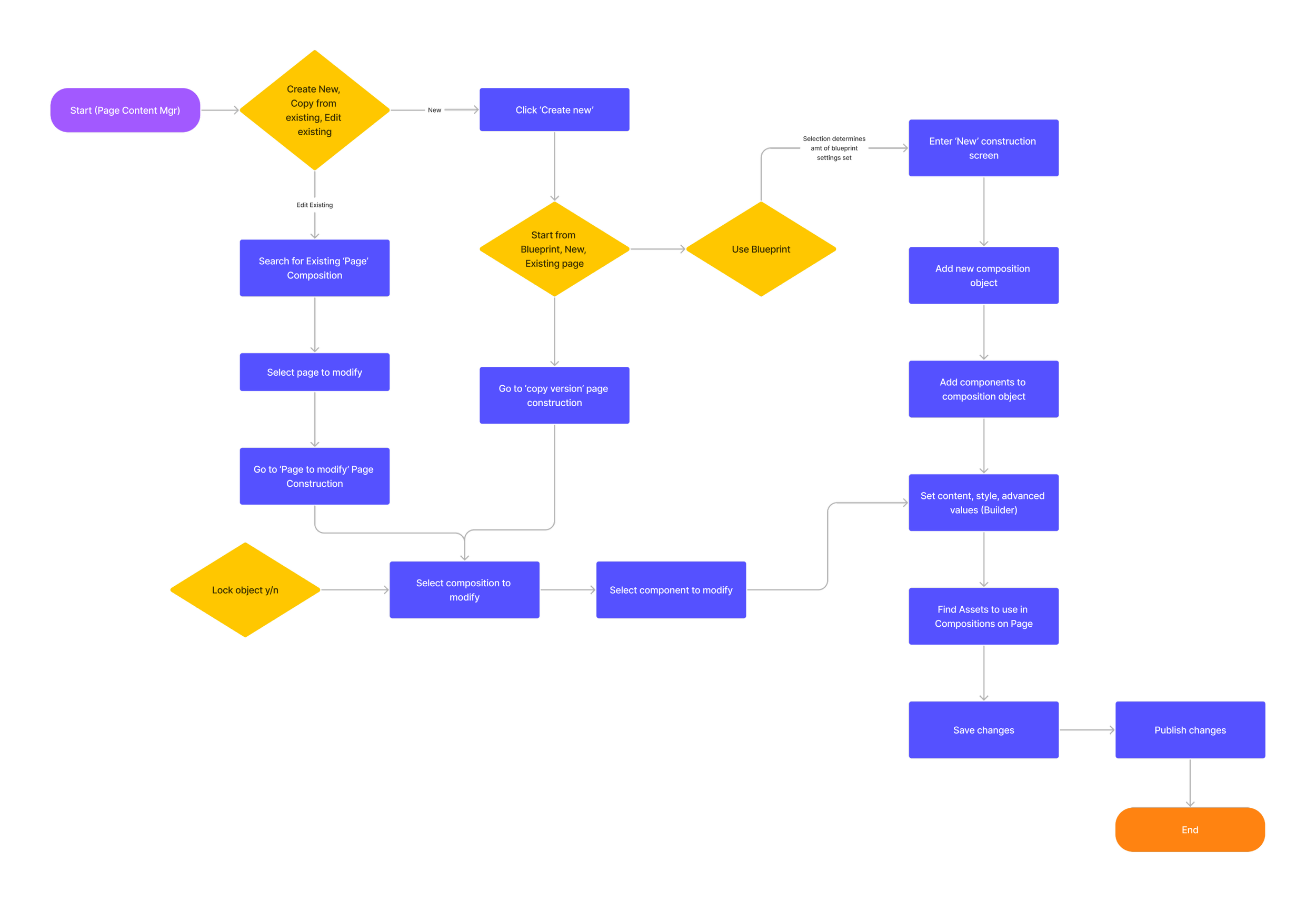 I created this “publish flow” to show how a page progresses through authoring/draft, review/approval, and publishing states via users of different approval levels.